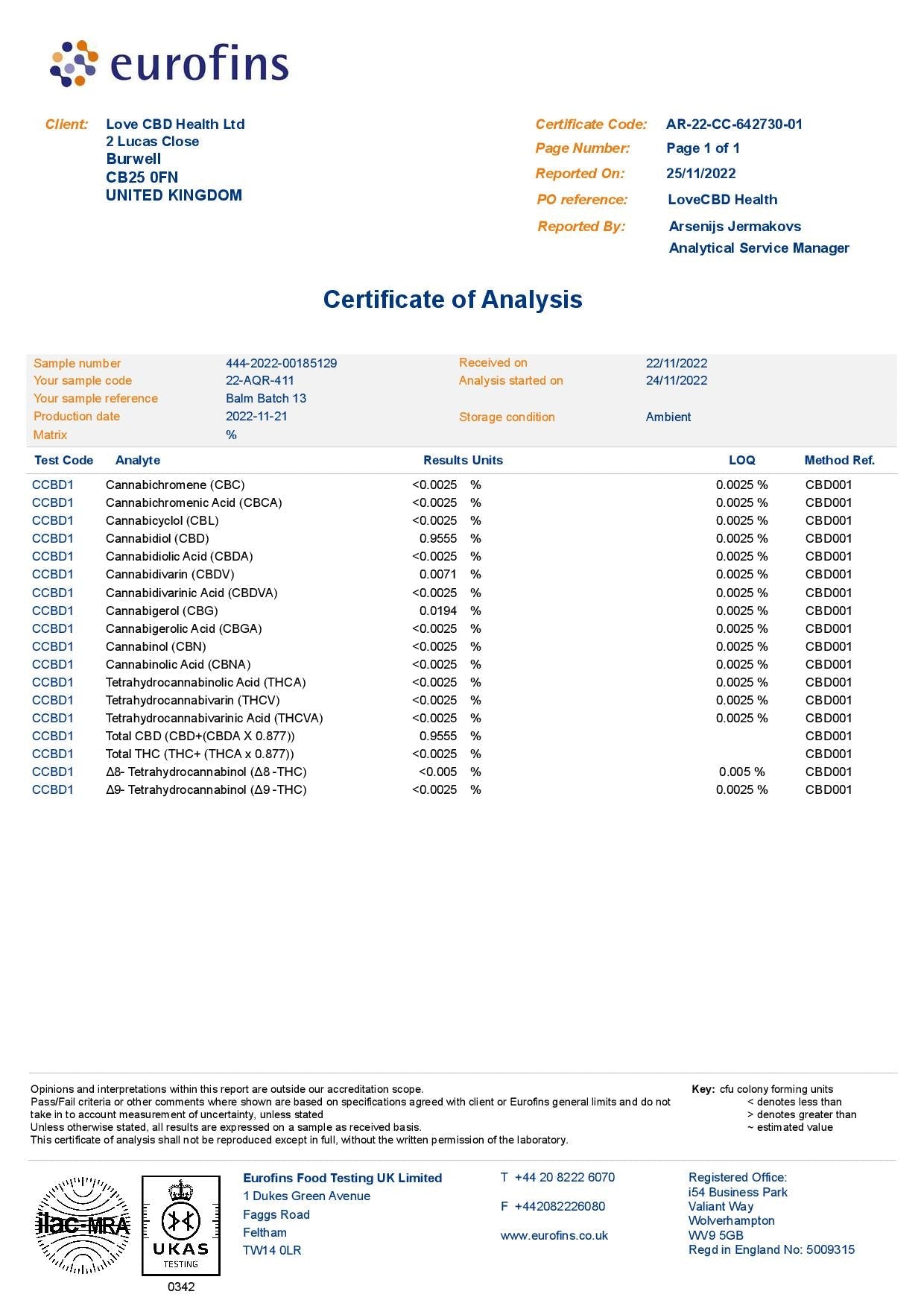 The Love CBD 1000mg CBD Balm is a multi-purpose cannabis-infused skin balm that comes in a sizable 100g jar. As well as containing the CBD-laden extracts of cannabis, this 1000mg CBD balm also contains hemp seed oil and terpenes, which all meld together into a wonderful, cannabis-rich CBD balm. The balm makes a wonderful massage aid and is well suited for both sports and physio purposes as a muscle balm or in a more sensual and relaxing setting to help unwind after a busy day. Because this CBD balm contains ingredients including coconut oil and shea butter, it also works really well as a general purpose skin moisturiser and conditioner which is gentle on most skin types. The Love CBD balm has a fresh and slightly citrusy aroma as a result of the terpenes that are naturally occurring within the broad spectrum cannabis extract that is used within the product. With a near endless list of uses, you’ll find that a little Love CBD Balm goes a long way. Love CBD's cannabis is grown on farms that do not use pesticides, herbicides, artificial fertilisers or harmful chemicals.