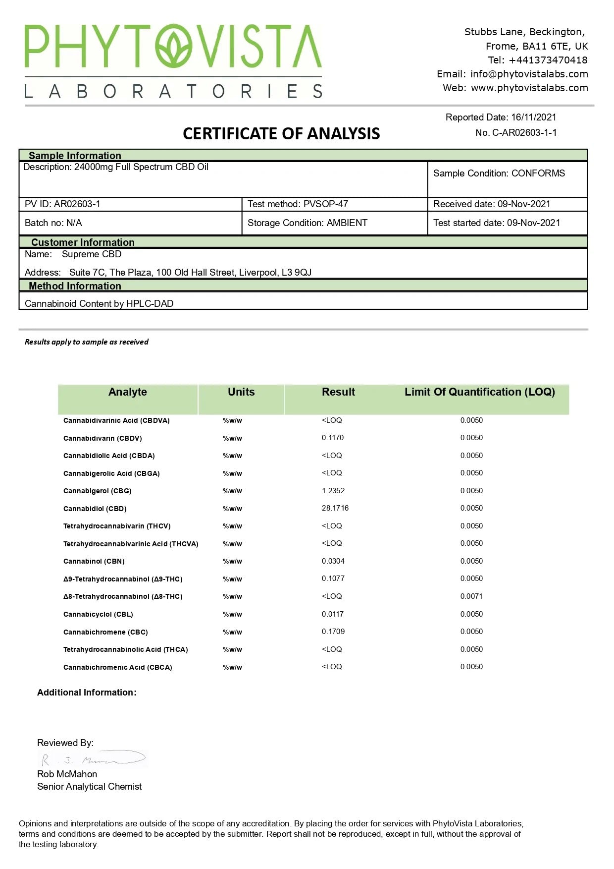 If you're looking for a high-quality, organic full spectrum CBD oil to experience for yourself, then you can't do better than with Supreme CBD's own 24000mg Full Spectrum CBD Tincture Oil where with a healthy dose of CBD will allow both your body and mind to experience all the effects of the whole hemp plant. Their 24000mg CBD Oil is the strongest product on the market and the perfect product for advanced and experienced users of their products.